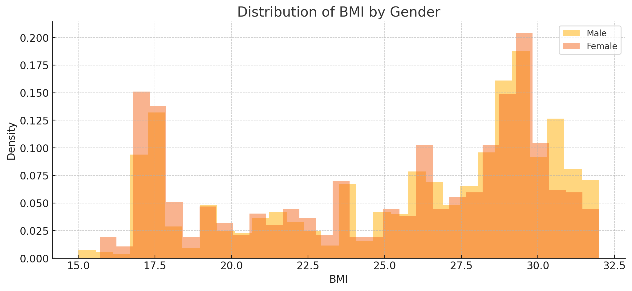 The BMI distribution appears normal for both genders, though slightly skewed.