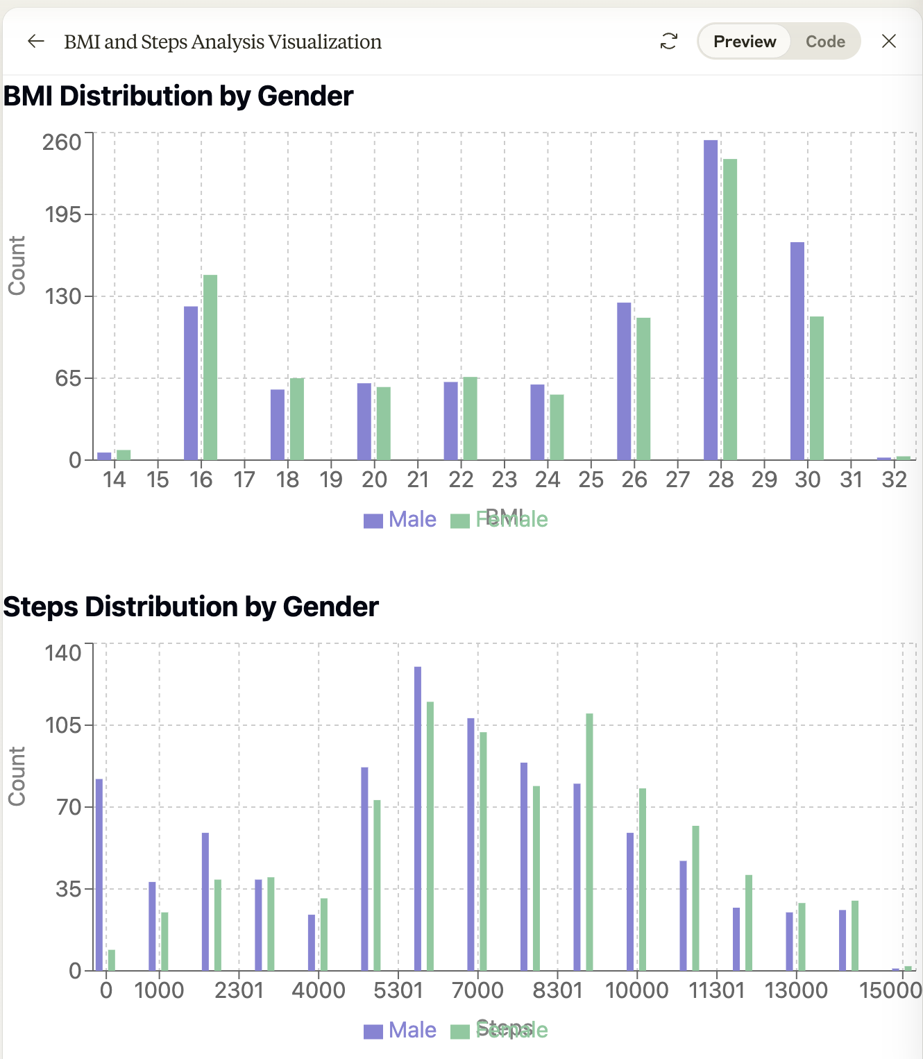 These findings suggest that while physical activity (measured by steps) has some relationship with BMI, it’s not a strong determinant on its own. The gender differences in both steps and BMI distributions might reflect different lifestyle patterns or biological factors between males and females in this sample.