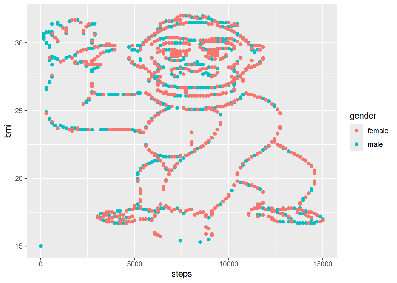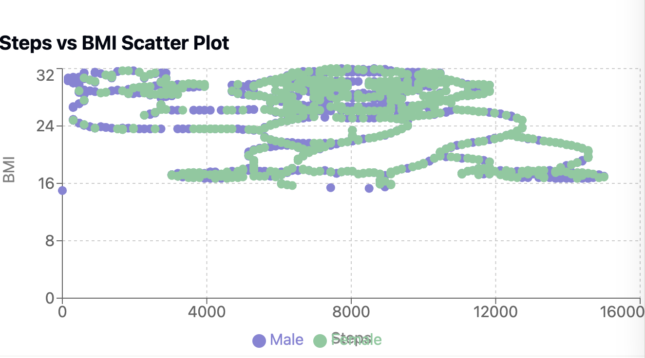 This pattern strongly suggests that this data has been artificially generated or heavily processed. Real BMI and steps data would typically show much more random variation and natural scatter. The regular geometric patterns we see here are characteristic of: - Either synthetic data generated using mathematical functions - Or real data that has been somehow quantized or processed through some kind of algorithm
